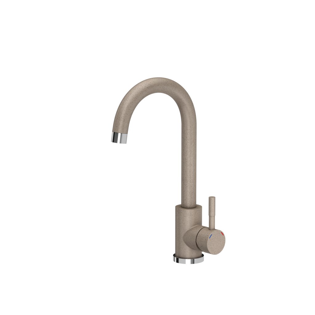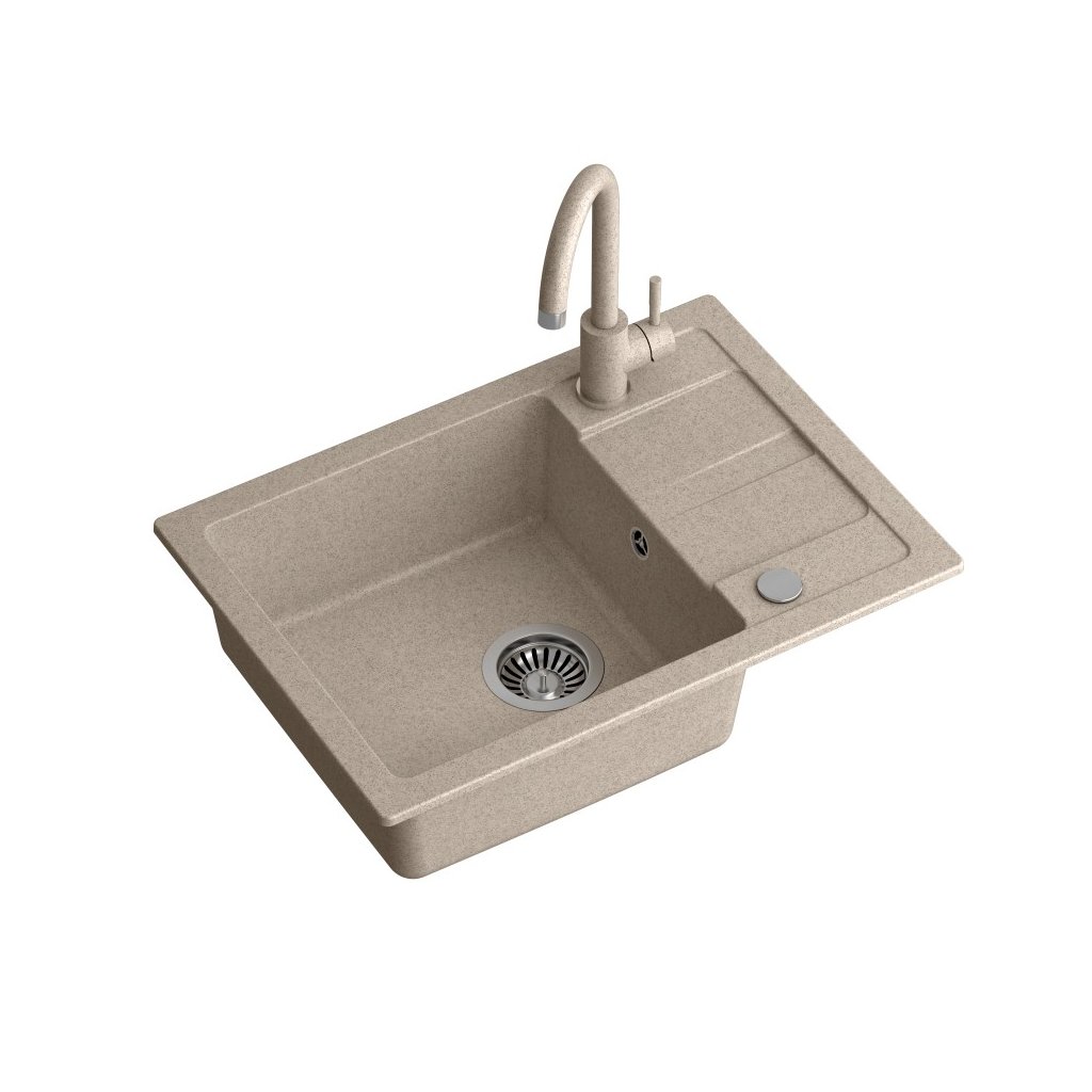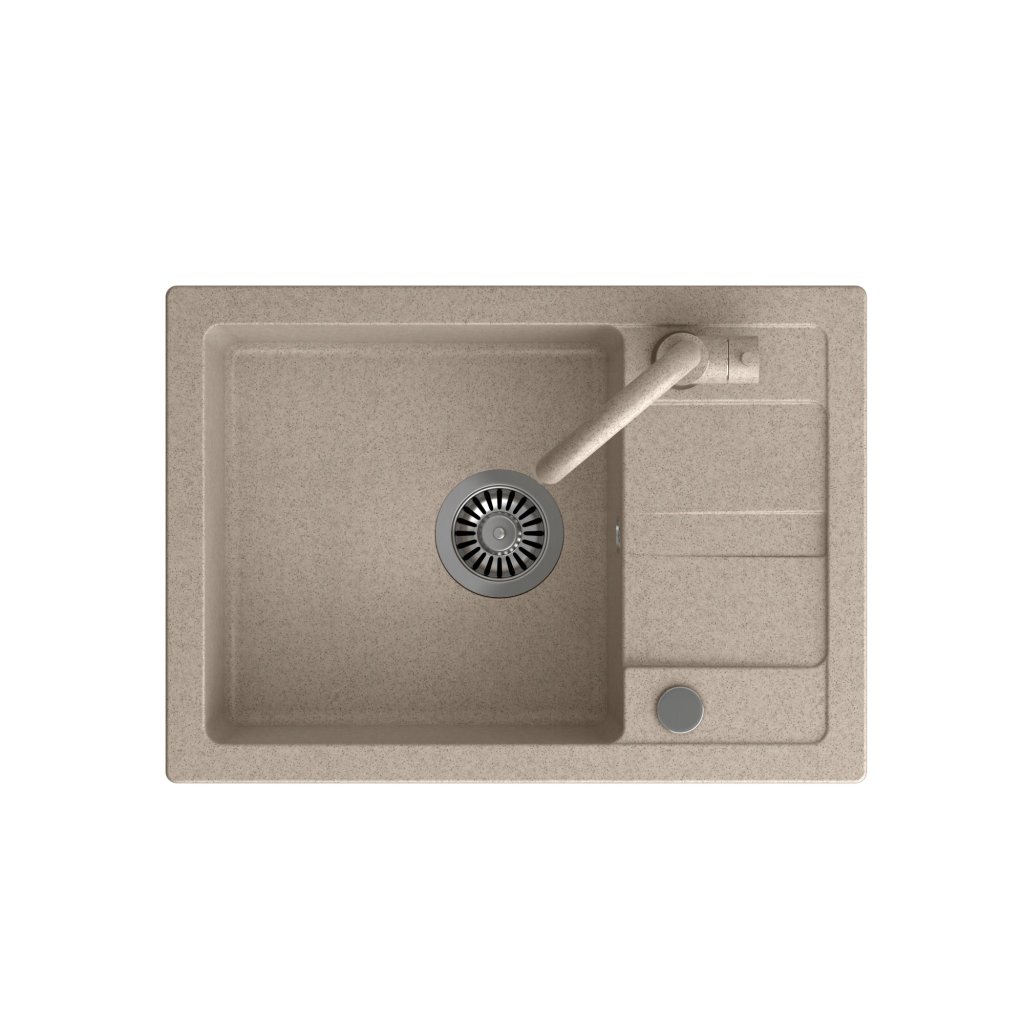 Béžový granitový vestavný dřez s odkapávací plochou, baterií, sifonem a záslepkou