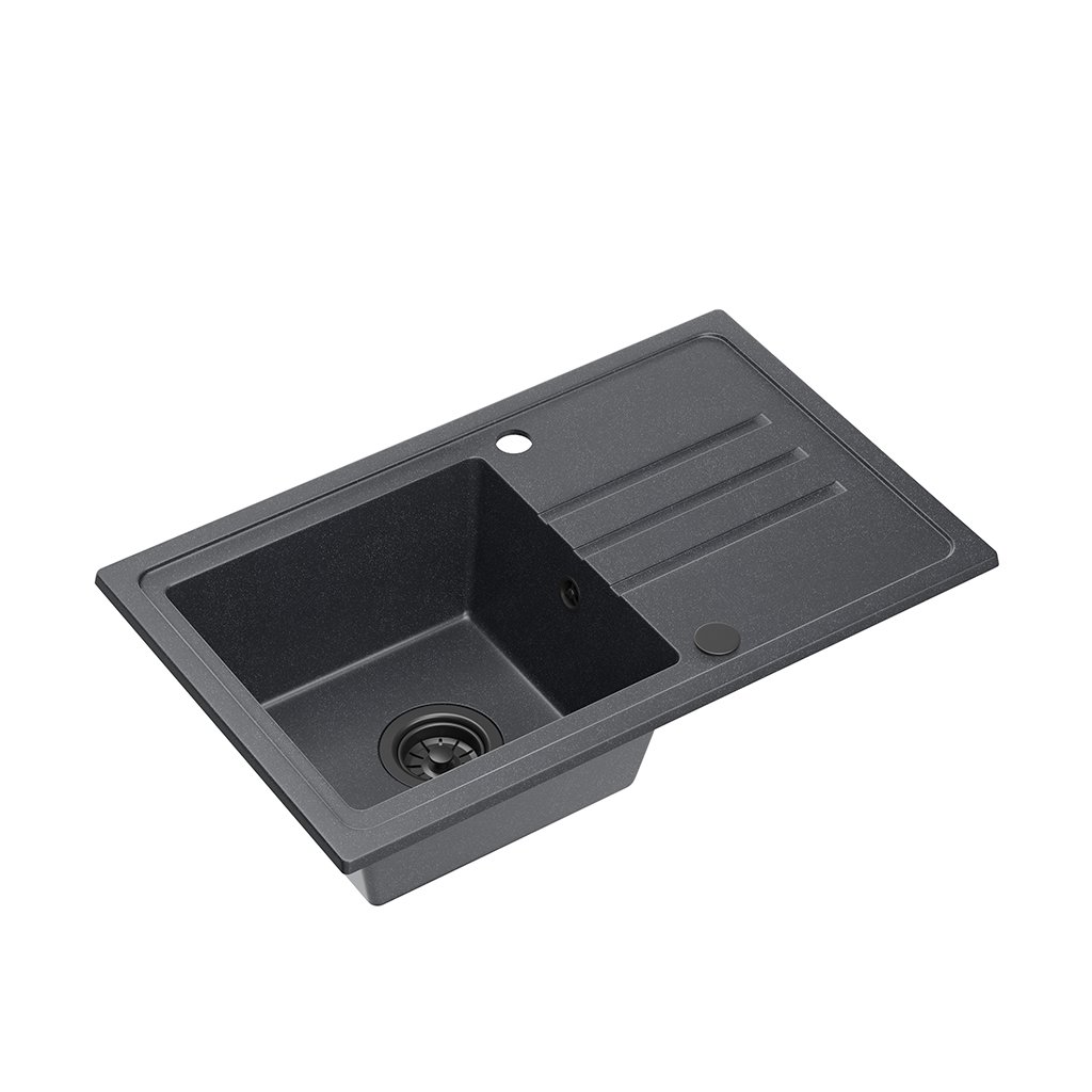 Černý granitový vestavný dřez s odkapávací plochou, baterií, černým sifonem a černou záslepkou, oboustranné provedení