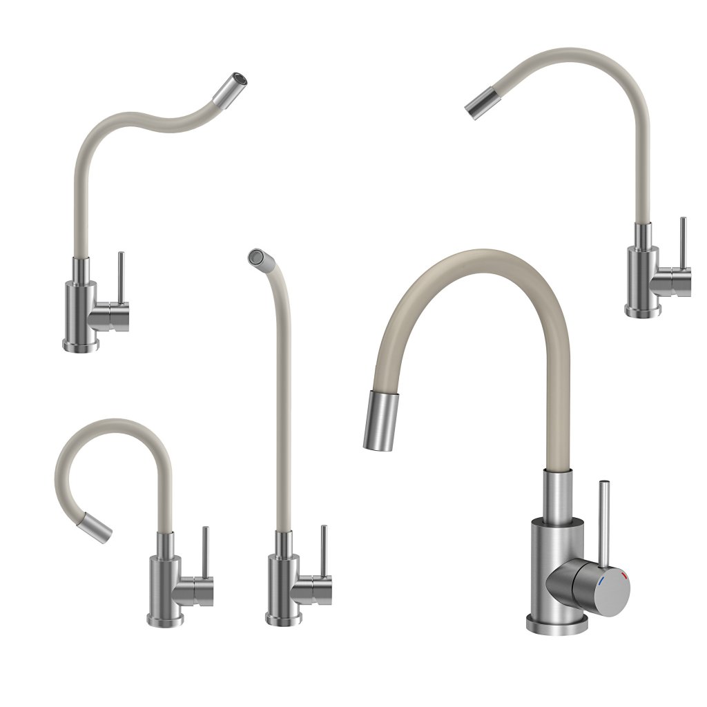 Páková baterie FLEXI MAGGIE, elastická, stojící. Ohebná hubice usnadňuje každodenní používání baterie, a to i mimo dřez, což usnadňuje plnění velkých hrnců nebo kbelíků vodou. Díky nastavitelné hadici dosáhnete proudem vody do každého koutu vašeho dřezu. Dřezová baterie FLEXI je vyrobena z nerezové oceli s nulovým obsahem olova, díky čemuž je zcela bezpečná pro zdraví.