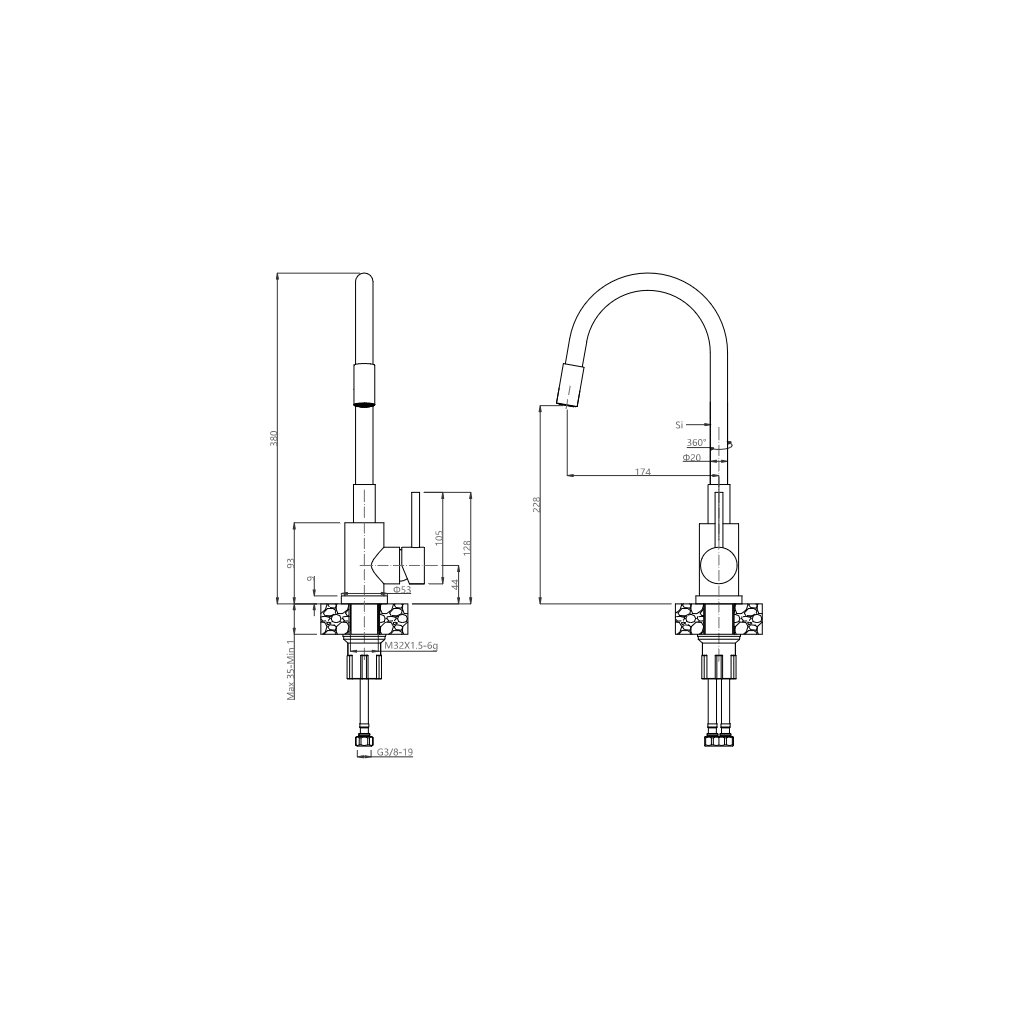 Páková baterie FLEXI MAGGIE, elastická, stojící. Ohebná hubice usnadňuje každodenní používání baterie, a to i mimo dřez, což usnadňuje plnění velkých hrnců nebo kbelíků vodou. Díky nastavitelné výtokové trubici dosáhnete proudem vody do každého koutu vašeho dřezu. Kuchyňská baterie FLEXI je vyrobena z nerezové oceli s nulovým obsahem olova, díky čemuž je zcela bezpečná pro zdraví.