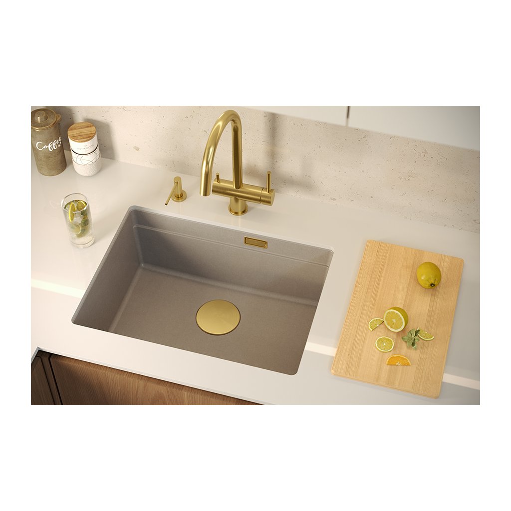 Béžový kuchyňský granitový dřez Logan 100, jednokomorový k instalaci pod kuchyňskou desku.