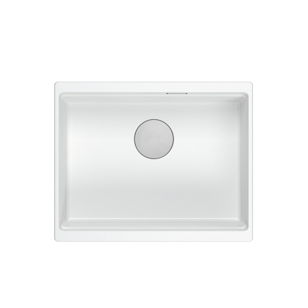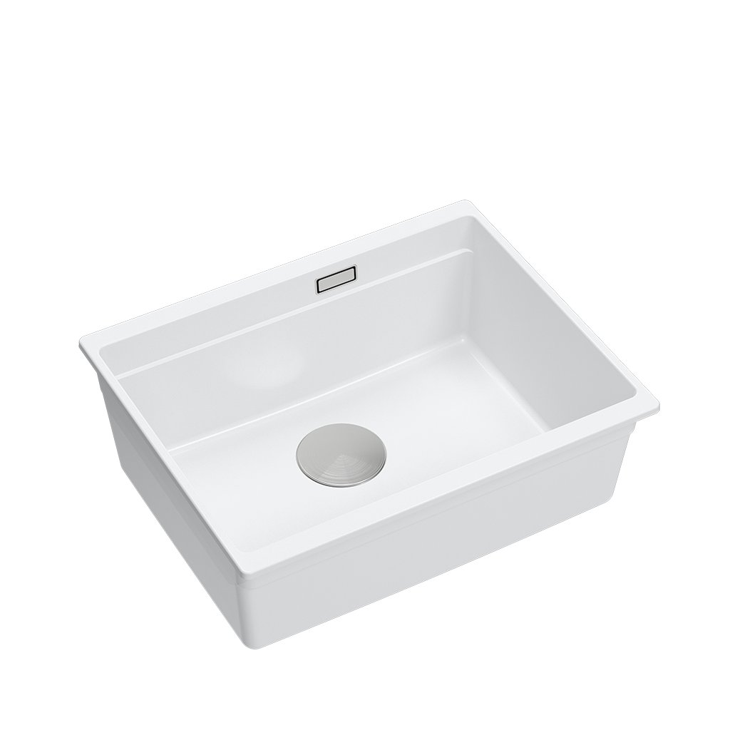Bílý kuchyňský granitový dřez Logan 100, jednokomorový k instalaci pod kuchyňskou desku.