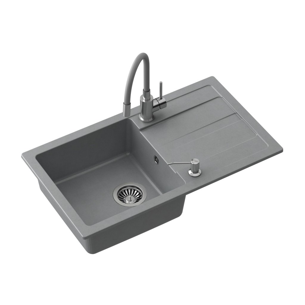 Šedý kuchyňský granitový dřez QUADRON READY- MAX + BATERIE A DÁVKOVAČ NA SAPONÁT Dárek ZDARMA: bambusové prkénko 36x20x1,2cm