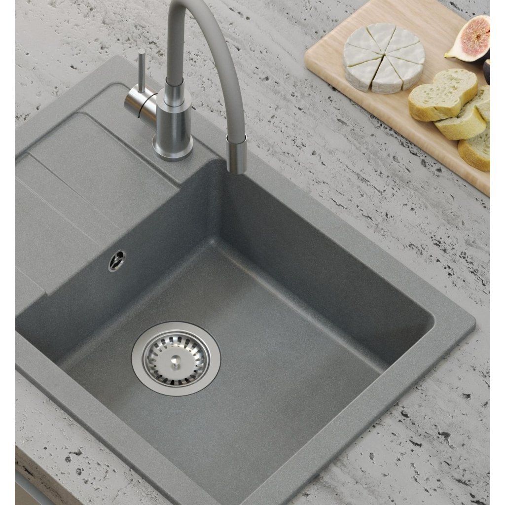 Šedý kuchyňský granitový dřez QUADRON READY- SMART + BATERIE A DÁVKOVAČ Dárek ZDARMA: bambusové prkénko 36x20x1,2cm