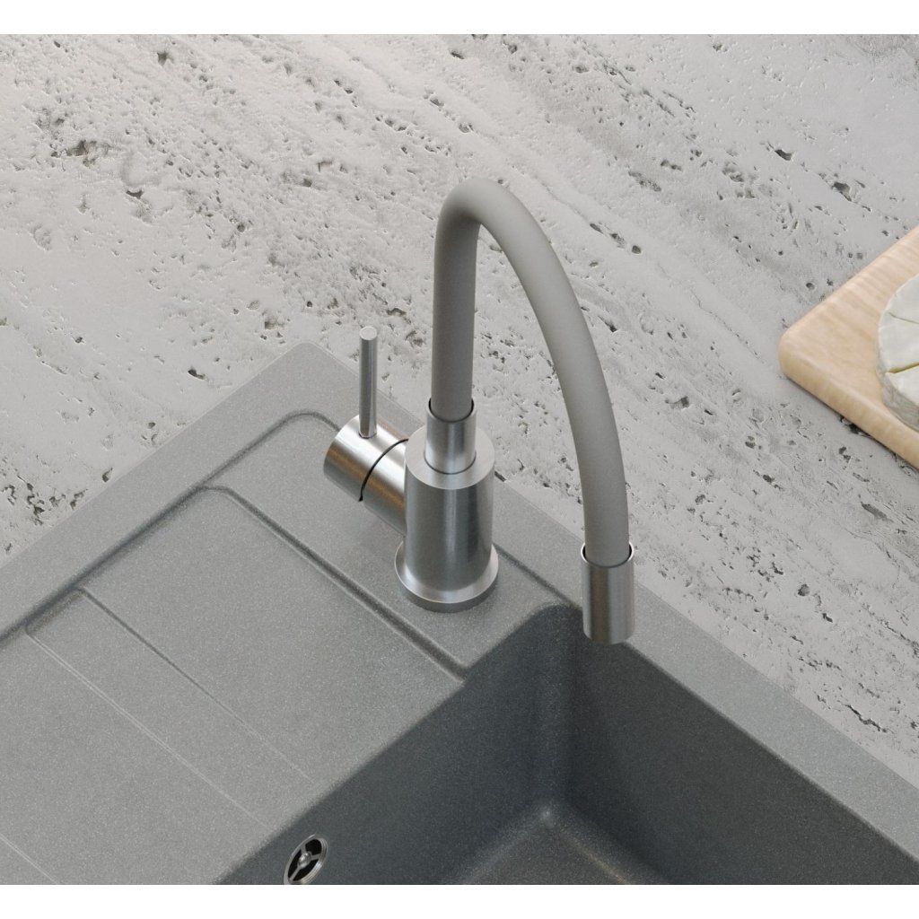 Šedý granitový vestavný dřez s odkapávací plochou, flexi baterií a dávkovačem